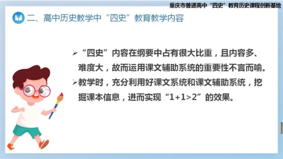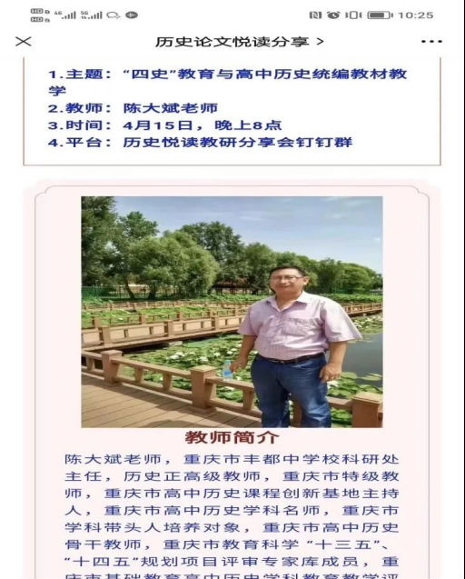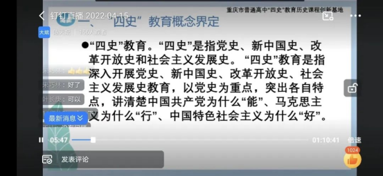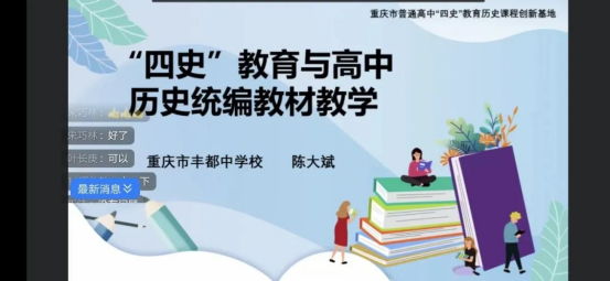 为响应党中央号召,进一步深化“四史”学习教育,加强“四史”教育与高中历史教学的联系, 2022年4月15日晚8:00,由历史悦读教研分享会主办,重庆市“四史”教育历史课程创新基地承办的《“四史”教育与高中历史统编教材教学》主题讲座活动在历史悦读教研分享会钉钉群隆重举行。